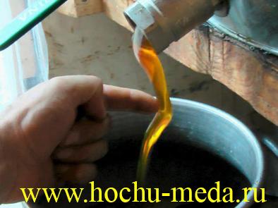 Зрелый мёд очень густой, ещё тёплый он медленно вытекает из медогонки и не процеживается через сито. В течение месяцев мелкие восковые крошки поднимаются на поверхность, которые периодически приходится собирать. Мёд из белых сотов, только что отстроенных пчёлами более качественный и дольше не кристаллизуется. А густой нектар проходит через сито свободно, да и восковой крошки то нет, так как он вылетает из сотов как вода, при этом соты остаются как новые.
